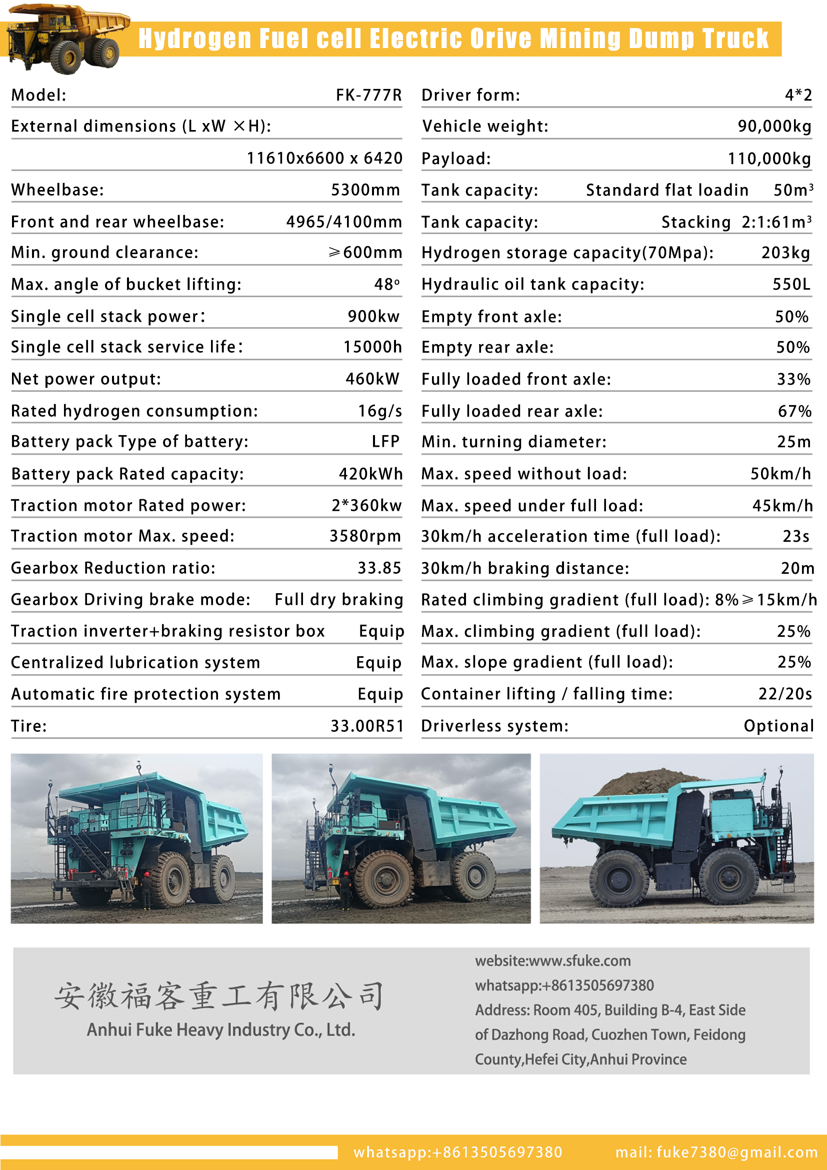 | Vehicle Type | Hydrogen Fuel cell Electric Drive Mining Dump Truck |